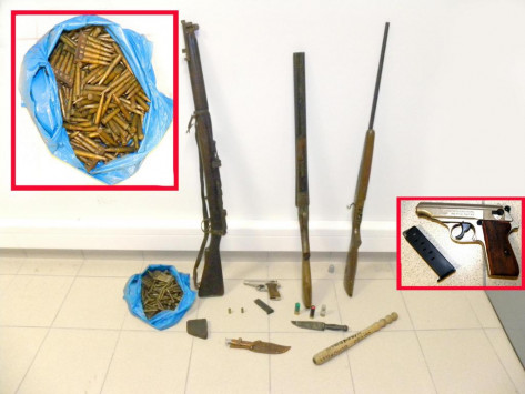 ενώ ο 24χρονος έκρυβε στο σπίτι του το πολεμικό όπλο. Το πιστόλι, το οποίο είναι διαμετρήματος 9mm, κατασχέθηκε. Κατά τη διάρκεια ερευνών που έγιναν στα σπίτια των δύο συλληφθέντων βρέθηκαν και κατασχέθηκαν :Πολεμικό τυφέκιο με γεμιστήρα, 228 φυσίγγια του πολεμικού όπλου, κυνηγετικό όπλο (δίκαννο) χωρίς αδεία οπλοκατοχής, κυνηγετικό όπλο τύπου Flober χωρίς αδεία οπλοκατοχής, πέντε φυσίγγια, δύο κάλυκες, ένα ξύλινο ρόπαλο μήκους 42 εκατοστών και δύο μαχαίρια συνολικού μήκους 22 και 23 εκατοστών αντίστοιχα.