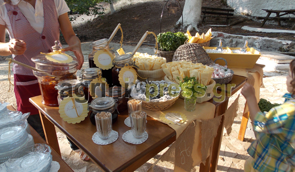 Λιτός στολισμός με κυρίαρχο χρώμα το λευκό, ένας μικρός μπουφές όπου οι καλεσμένοι μπορούσαν να απολαύσουν γλυκά του κουταλιού και άλλα τοπικά εδέσματα και δυο νεαρές κοπέλες με παραδοσιακές φορεσιές που μοίραζαν λευκά τριαντάφυλλα.