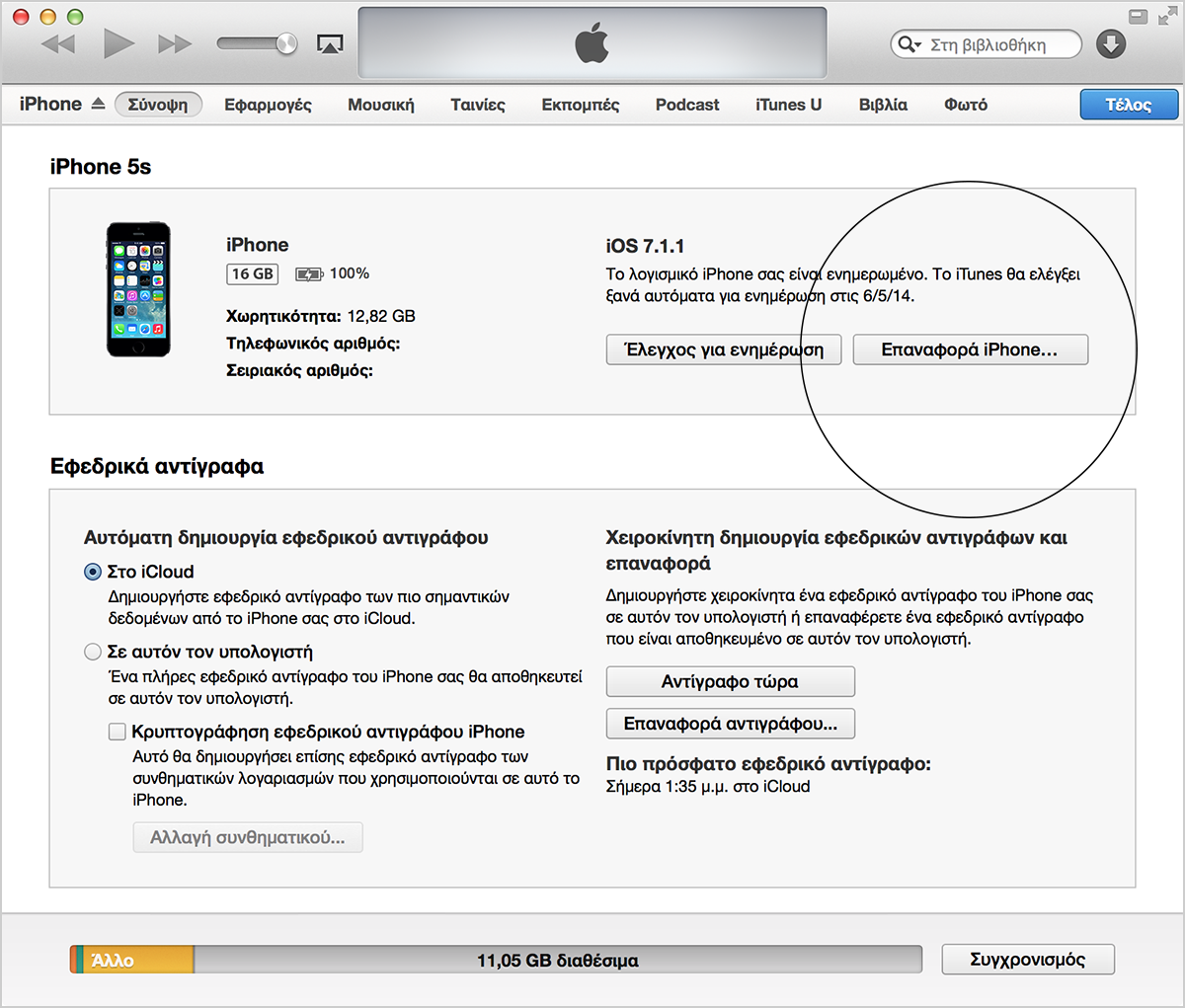 Χρήση του iTunes Αν έχετε συγχρονίσει τη συσκευή σας με το iTunes, μπορείτε να την επαναφέρετε.