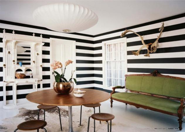 Τολμηρές σκουρόχρωμες ρίγες που συνδυάζονται με vintage επίπλωση δίνουν δραματικό τόνο σε ένα δωμάτιο