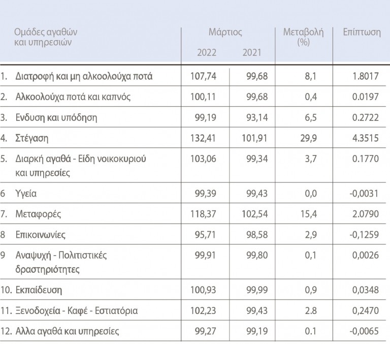 Μείωση του κόστους τηλεπικοινωνιών κατά 2,9% σε 12μηνη βάση, ενώ εκτοξεύτηκαν η στέγαση κατά 29,9%, η διατροφή κατά 8,1%, οι μεταφορές κατά 15,4% και συνολικά ο δείκτης καταναλωτή κατά 8,9% (στοιχεία ΕΛΣΤΑΤ για τον Μάρτιο του 2022)