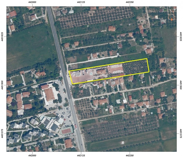 Το γήπεδο είναι ιδιαίτερα επίμηκες με πρόσωπο νοτιοδυτικά στην παράπλευρη της νέας οδού σε πλευρά 36,50μ, ενώ έχει βάθος 202,30μ και γειτνιάζει με άλλα αγροτεμάχια. Είναι γενικά επίπεδο, περιφραγμένο και στο μέσο του περίπου έχει ανεγερθεί διώροφο κτίριο με κεραμοσκεπή, που στέγαζε λειτουργίες της επιχείρησης.