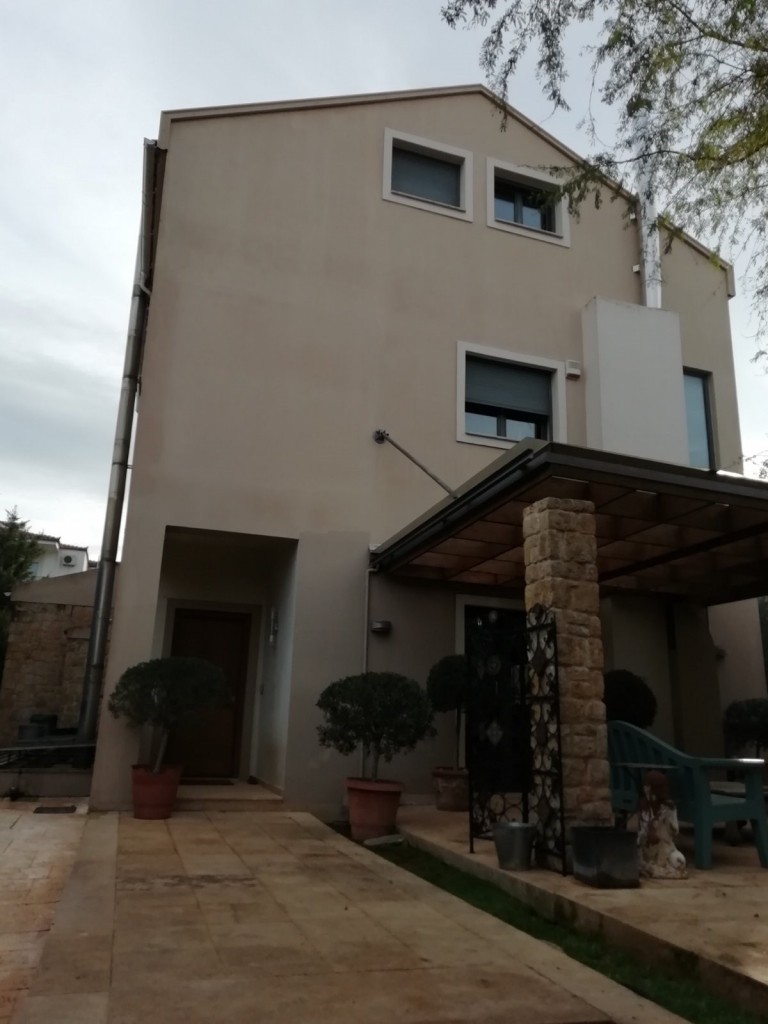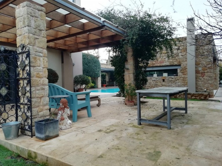 Επί του οικοπέδου υφίστανται δύο κτίσματα: μια διώροφη κατοικία με υπόγειο και στέγη, και μία νέα ισόγεια κατοικία με υπόγειο και πισίνα.