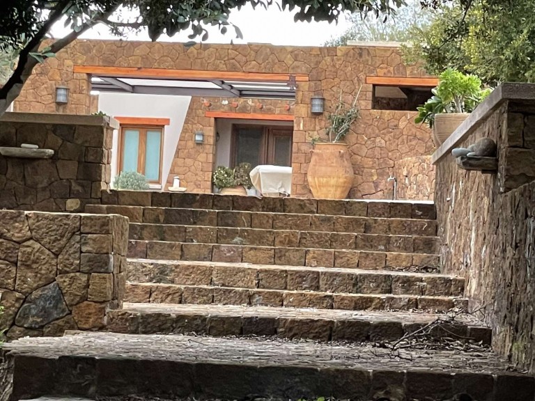 • Κτίριο Β2, το οποίο είναι ισόγειος χώρος συνολικής επιφάνειας 128 τ.μ. και εξυπηρετεί το κτίριο Α, αποτελούμενο από δύο συνεχόμενους όγκους που δημιουργούν ένα σχήμα γάμμα (Γ), νοητά χωροθετημένο πίσω από το κτίριο Α, δημιουργώντας εσωτερική αυλή μεταξύ των κτισμάτων. Στον έναν χώρο του κτιρίου αυτού βρίσκεται η βασική κουζίνα με ένα μπάνιο, ενώ στον άλλο χώρο αυτόνομος χώρος κατοικίας, αποτελούμενος από καθιστικό, τζάκι, υπνοδωμάτιο και μπάνιο. Είναι εντελώς ανεξάρτητο από τα κτίρια Α και Β και έχει τη δυνατότητα ανεξάρτητης φιλοξενίας μέχρι και τεσσάρων ατόμων. Το τμήμα του κτιρίου αυτού (Β2) με την αυτόνομη κατοικία βρίσκεται σε νοητή ευθεία από την πισίνα.