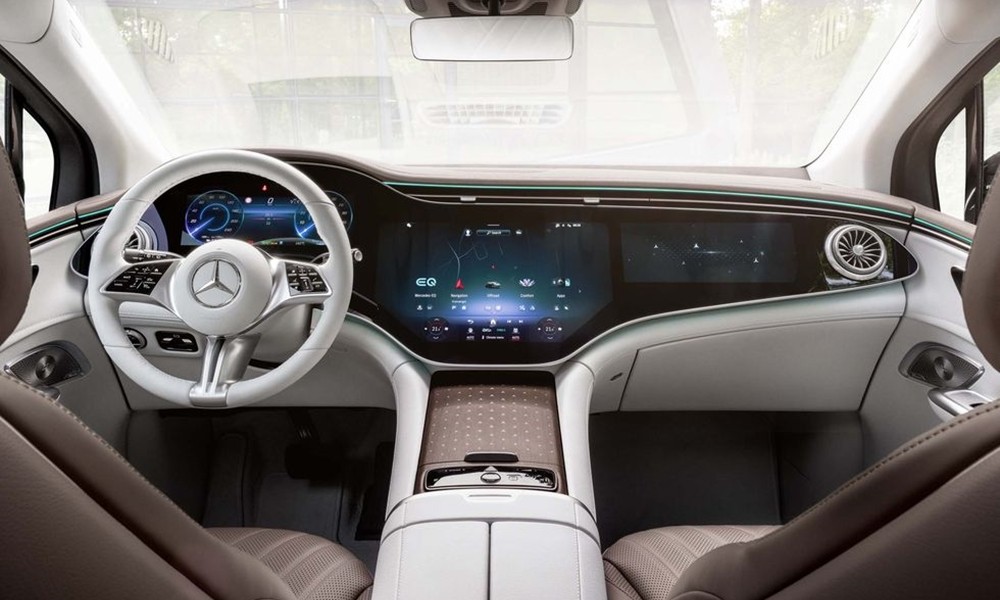 Στην κορυφαία εκδοχή του interface για το MBUX, οι τρεις οθόνες συγχωνεύονται για να δημιουργήσουν μια οθόνη με πλάτος άνω των 141 εκατοστών. Ο συνοδηγός στην EQE SUV, έχει την επιλογή μιας οθόνης OLED 12,3 ιντσών με τη δική του, ξεχωριστή, διεπαφή χρήστη. Το λειτουργικό του αυτοκινήτου χρησιμοποιεί ένα έξυπνο λογισμικό «μπλοκαρίσματος» που βασίζεται στην εικόνα που παίρνει από την κάμερα που αναγνωρίζει πότε ο οδηγός κοιτάζει προς την οθόνη του συνοδηγού και τότε το σύστημα μειώνει αυτόματα το περιεχόμενο (π.χ. την ταινία που μπορεί να βλέπει ο συνοδηγός) για λόγους ασφαλείας.