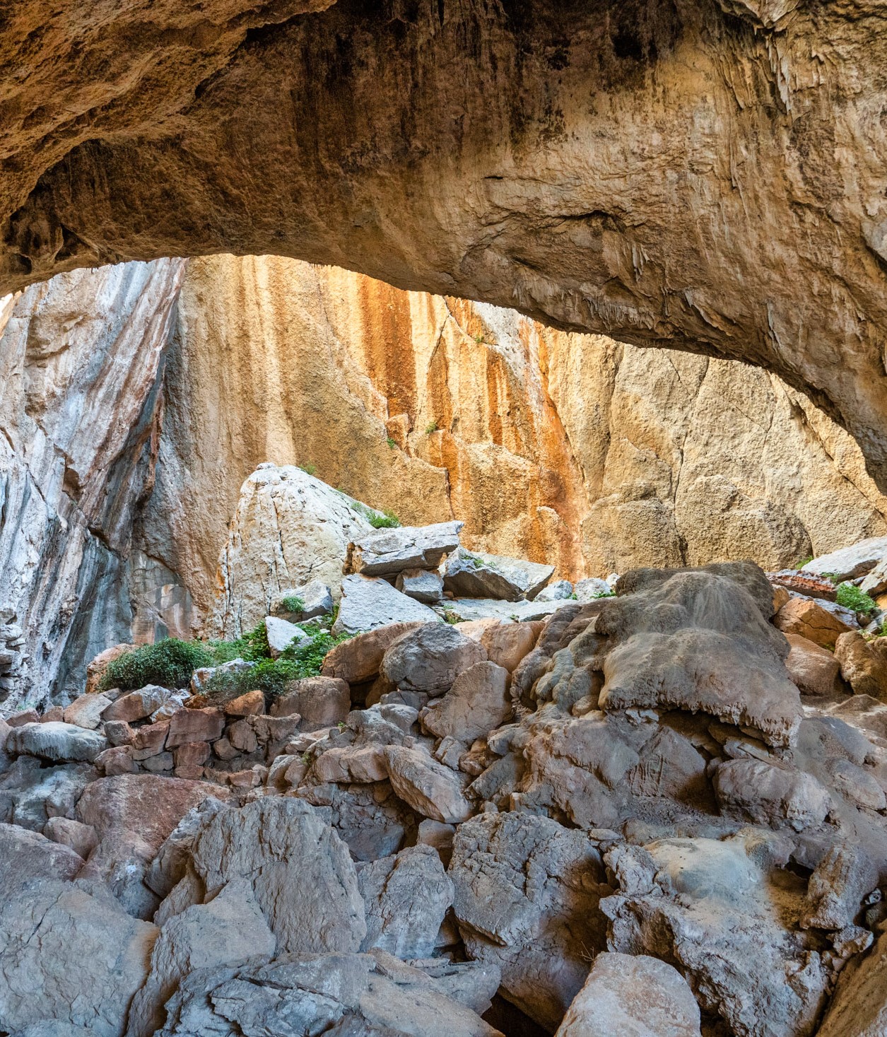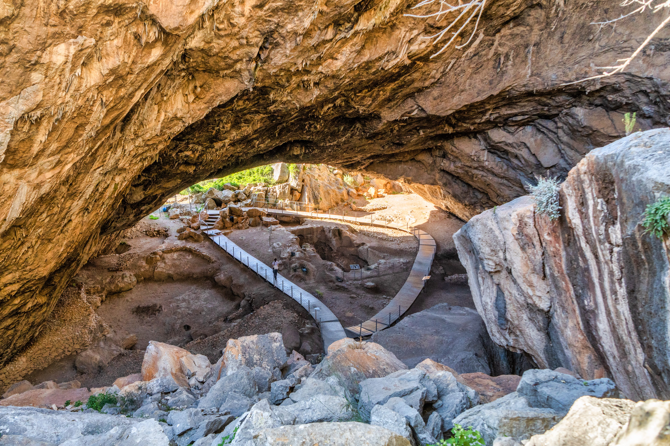 Καθισμένη κάτω από τον τεράστιο πέτρινο «θόλο» του με το τεράστιο μακρόστενο άνοιγμα που δημιούργησαν κατολισθήσεις, βλέπω σταγόνες να σταλάζουν σε διάφορα σημεία των ξύλινων διαδρόμων που το διατρέχουν. Βλέπω τις μορφές και τα σχήματα των γεωολογικών σχηματισμών στους κάθετους βράχους. Αισθάνομαι ότι έχω τη σπάνια ευκαιρία μίας συνάντησης με τους πολύ μακρινούς μας προγόνους. Εδώ, έμπαιναν κι εκείνοι, έκαναν τις τελετουργίες τους, προφύλασσαν τα ζώα τους, έβγαιναν έξω, ατένιζαν το πέλαγος, ζεσταίνονταν από τον ήλιο και έφτιαχναν εργαλεία και κοσμήματα. 40.000 χρόνια πριν -αυτή είναι η χρονολόγηση της πιο πρώιμης κατοίκησης στο σπήλαιο που απλώνεται γύρω μου σαν πέτρινη αγκαλιά.