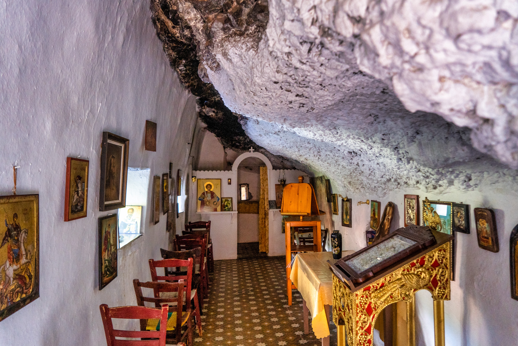 Κοιτάζοντας ψηλά το κυκλικό σχήμα της δολίνης είναι ξεκάθαρο, κοιτάζοντας δεξιά βλέπουμε αμέσως το ένα από τα δύο εκκλησάκια που κτίστηκαν ένθετα σχεδόν στα κάθετα κοκκινωπά βράχια -γι’ αυτό θεωρείται πως η μικρή δολίνη χρησιμοποιήθηκε στους βυζαντινούς χρόνους ως τόπος χριστιανικής λατρείας. Είναι ο Άγιος Γεώργιος ο οποίος ασβεστώθηκε σε προηγούμενα χρόνια. Αλλιώς θα φαινόταν καθαρά μία βυζαντινή επιγραφή που θεωρείται πως υπήρχε, και τοιχογραφίες λαϊκής τεχνοτροπίας (ίσως του 13ου αιώνα) ίχνη των οποίων διατηρούνται. Η εκκλησία της Μεταμόρφωσης του Σωτήρος, που θα εντοπίσουμε κάνοντας τον γύρο, είναι ολόκληρη κτισμένη μέσα στους κάθετους βράχους και θεωρείται μεταγενέστερη από τον Άγιο Γεώργιο.