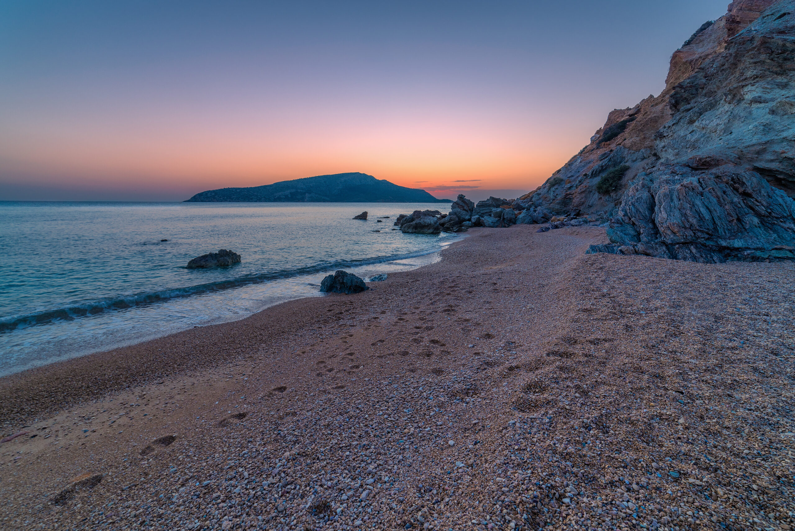 Η παραλία είναι ένας κολπίσκος στην ακτή του οποίου κυριαρχεί το βότσαλο και το ψιλό χαλίκι. Δέντρα δεν υπάρχουν, η όποια φυσική σκιά προκύπτει σε ένα μικρό κομμάτι στα αριστερά της παραλίας από τις σπηλιές που δημιουργούν τα βράχια, επομένως η ομπρέλα είναι απαραίτητη. Τα νερά της είναι καταγάλανα και δροσερά. Σίγουρα, δεν θυμίζουν παραλίες της Αττικής, περισσότερο θα έχετε την αίσθηση ότι είστε σε κάποιο νησί στη μέση του Αιγαίου.