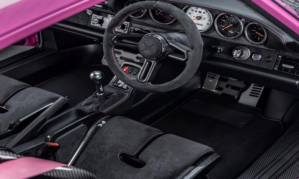 Το ξεχωριστό χαρακτηριστικό της κατασκευής της δεξιοτίμονης Porsche, είναι η ειδικά σχεδιασμένη ροζ περλέ μεταλλική βαφή 3 σταδίων, που εφαρμόζεται στο αμάξωμα από ανθρακονήματα. Αυτός ο ιδιαίτερος συνδυασμός χρωμάτων, συμπληρώνεται με πινελιές από ανθρακονήματα σε διάφορα μέρη, όπως ο διαχωριστής, οι εισαγωγές, οι ρίγες του καπό, το πίσω φτερό και οι ζάντες σε στυλ Fuchs με πέντε ακτίνες.