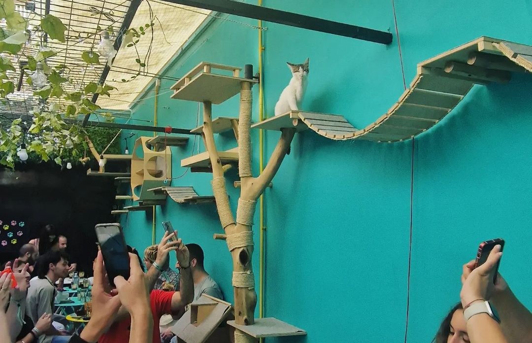 Ένα διαφορετικό μαγαζί, το οποίο άνοιξε πρόσφατα τις πόρτες του, βρίσκεται σε μια υπέροχη γειτονιά, στο Θησείο, στην οδό Νηλέως 64. Πρόκειται για το Cat Cafe. Στο μαγαζί αυτό οικοδεσπότες είναι υπέροχες γάτες, οι οποίες σε καλωσορίζουν με το πιο ωραίο νιαούρισμα του κόσμου. Υπάρχει, εδώ που τα λέμε, καλύτερο καλωσόρισμα από αυτό της γάτας;Μπαίνοντας στο χώρο ξαφνιάζεσαι. Δεν υπάρχει κάτι αντίστοιχο στη χώρα μας, καθώς το Cat Cafe είναι το πρώτο γατοκαφέ στην Ελλάδα. Πρόκειται για έναν υπέροχο, ζεστό, καθαρό και παρεΐστικο χώρο. Ένας παράδεισος για τις γάτες που ζουν μέσα. Αλλά και για εσένα που θα βρεθείς εκεί. Οι τετράποδες κυρίες, πρώην αδέσποτες που ψάχνουν σπίτι, σε πλησιάζουν για χάδια και αγκαλιές. Κάποιες βέβαια τρέχουν και παίζουν αγνοώντας εντελώς την ύπαρξή σου. Γάτες γαρ. Άλλες δεν έχουν τελειώσει ακόμα το φαγητό τους και μασουλάνε. Μετά κλασικά γλείφονται. Και άλλες σε κοιτούν στην κυριολεξία αφ’ υψηλού, καθισμένες στα ειδικά ράφια που είναι διαμορφωμένα στον τοίχο για να χαλαρώνουν και να ατενίζουν τον κόσμο από ψηλά. Και όλα αυτά σε μια υπέροχη, παιχνιδιάρικη και γεμάτη χρώματα αυλή. Δεν περνάνε και άσχημα, θα λέγαμε.