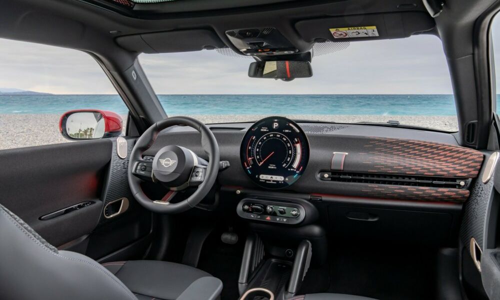 Οι πινελιές με «άρωμα» JCW δεν σταματούν μόνο στο αμάξωμα, αλλά επεκτείνονται και στο εσωτερικό. Όπως τα μπάκετ καθίσματα που είναι επενδυμένα από συνθετικό δέρμα με κόκκινες ραφές.