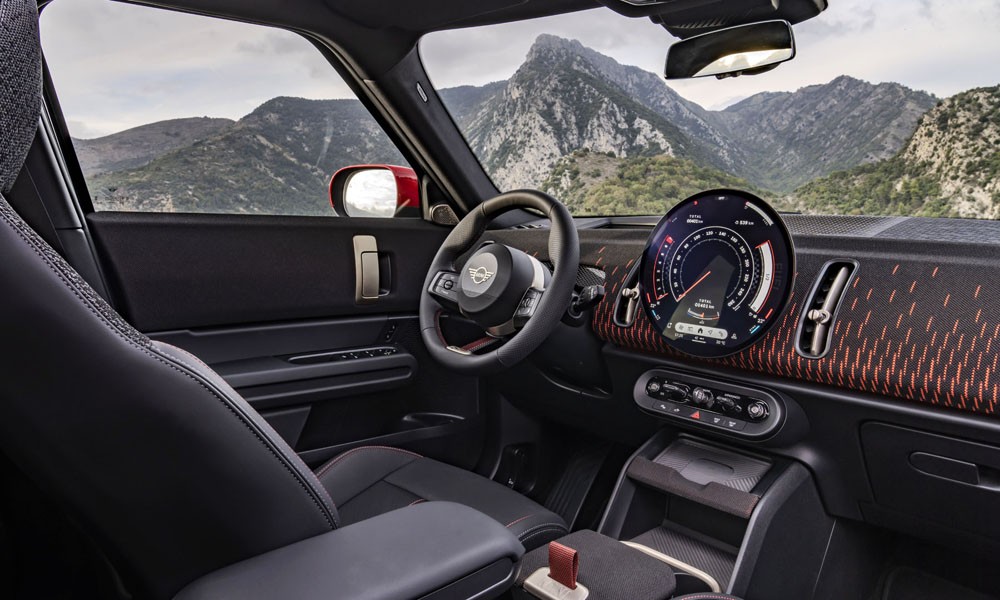 Στο εσωτερικό, το νέο MINI John Cooper Works Countryman έχει πιο σπορ πινελιές, καθώς κυριαρχούν το κόκκινο και μαύρο χρώμα στο ταμπλό, κατά μήκος των θυρών και στα υψηλής ποιότητας σπορ καθίσματα JCW, τα οποία μια αναφορά στην αγωνιστική κληρονομιά της MINI. Το ταμπλό είναι κατασκευασμένο από δίχρωμο ύφασμα από ανακυκλωμένο πολυεστέρα.