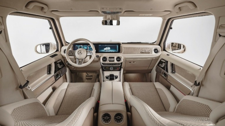 Η Mercedes-Benz G-Class της Carlex Vintage έχει ένα εντελώς νέο εσωτερικό. Τα περισσότερα στοιχεία είναι χειροποίητα όπως το διάτρητο δέρμα στα καθίσματα, τα ανάγλυφα εξαρτήματα στα μαρσπιέ των θυρών, την επένδυση alcantara στα προσκέφαλα των καθισμάτων, την επένδυση από δέρμα nappa και τις χειροποίητες ραφές.