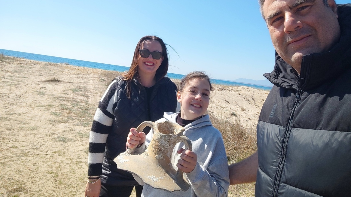 Μια εξόχως ευχάριστη έκπληξη περίμενε μια 9χρονη από την Κομοτηνή, η οποία μαζί με τον πατέρα της Χουβαρδά και τη μητέρα της έκανε την Κυριακάτικη βόλτα της στην ακτή της Μολυβωτής Ροδόπης στην περιοχή της αρχαίας Στρύμης.Περπατώντας στην παραλία, η μικρή Ευαγγελία «έπεσε» πάνω σε τμήμα ενός αμφορέα και εννοείται ενθουσιάστηκε που ανακάλυψε κάτι, που πιθανόν θα μπορούσε να εκτεθεί σε ένα μουσείο.