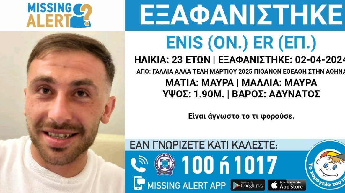 Στην Αθήνα εθεάθη στα τέλη Μαρτίου, σύμφωνα με πληροφορίες από το «Χαμόγελο του Παιδιού», ο 23χρονος Τούρκος Enis Er, ο οποίος έχει εξαφανιστεί από τον περσινό Απρίλιο από περιοχή της Γαλλίας. Το «Χαμόγελο του Παιδιού» ενημερώθηκε για την εξαφάνιση του στις 3 του φετινού Απριλίου και προχώρησε στη δημοσιοποίηση των στοιχείων του στις 9/4, κατόπιν αιτήματος της οικογένειας του, καθώς ενδέχεται να συντρέχουν λόγοι οι οποίοι θέτουν τη ζωή του σε κίνδυνο.
