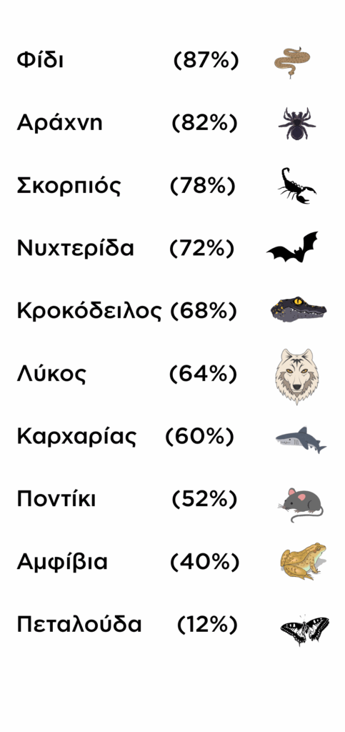 Φίδια, σκορπιοί, αράχνες, κροκόδειλοι και μεγάλα σαρκοφάγα βρίσκονται στην κορυφή της λίστας. Όμως εκεί που η έρευνα έγινε πραγματικά αποκαλυπτική, ήταν στο γεγονός ότι ζώα εντελώς ακίνδυνα, όπως οι αράχνες, οι νυχτερίδες, ακόμα και κάποια αμφίβια, κατατάχθηκαν πολύ ψηλά στην κλίμακα φόβου.