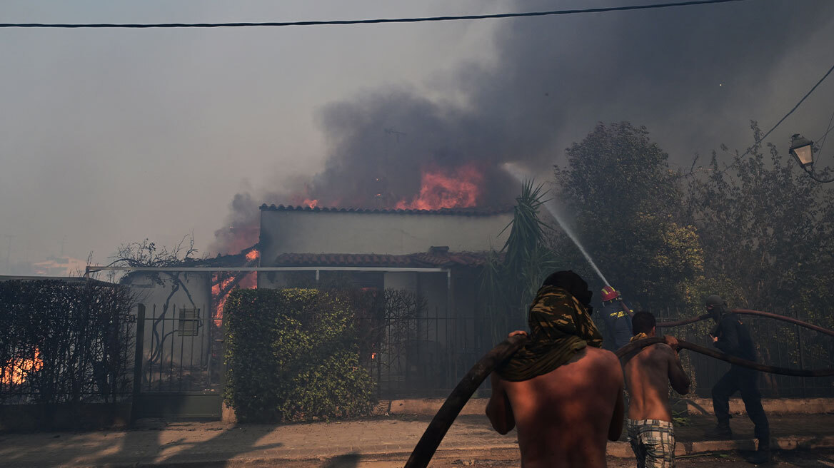 «Πολεμικό» είναι το κλίμα στο Κρυονέρι όπου μαίνεται η μεγάλη φωτιά. Κάτοικοι με λάστιχα στα χέρια προσπαθούν να σώσουν τις περιουσίες τους, τη στιγμή που ακούγονται εκρήξεις. «Έχουν καεί σπίτια. Οι εκρήξεις είναι από τα εργοστάσια και ίσως από λέβιτες από σπίτια που έχουν καεί πιο κάτω», λέει κάτοικος