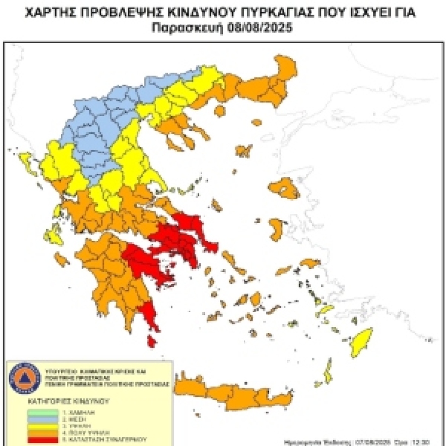 Σύμφωνα με τον Χάρτη Πρόβλεψης Κινδύνου Πυρκαγιάς που εκδίδει η Γενική Γραμματεία Πολιτικής Προστασίας του Υπουργείου Κλιματικής Κρίσης & Πολιτικής Προστασίας, για αύριο Σάββατο 09 Αυγούστου 2025, προβλέπεται ακραίος κίνδυνος σε τέσσερις περιφέρειες και υψηλός κίνδυνος πυρκαγιάς σε δέκα.