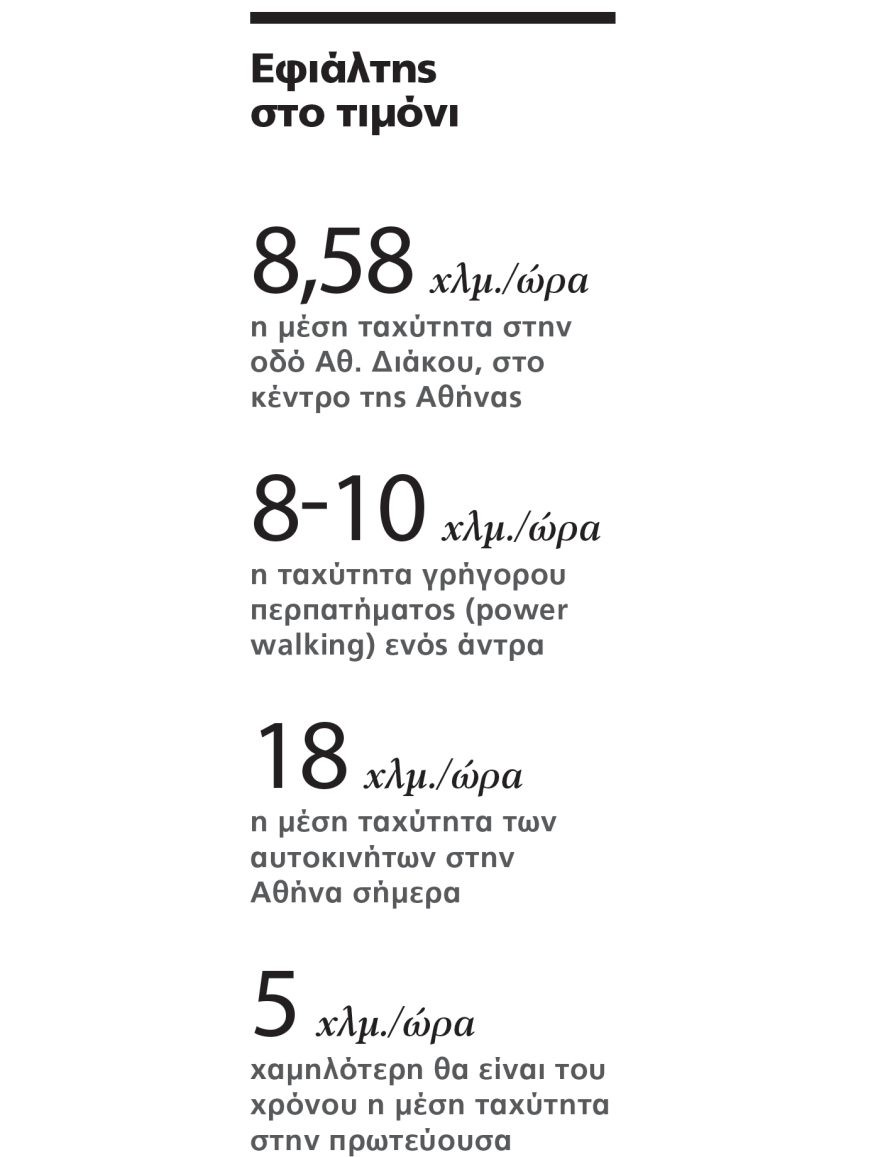 Οι μετρήσεις του Εργαστηρίου Κυκλοφοριακής Τεχνικής του Εθνικού Μετσόβιου Πολυτεχνείου είναι αποκαλυπτικές: στην οδό Αθανασίου Διάκου, στο κέντρο της Αθήνας -στο κομμάτι μεταξύ Αμαλίας και Καλλιρρόης- η μέση ταχύτητα τις ώρες της απογευματινής αιχμής, είναι τα 8,58 χιλιόμετρα ανά ώρα. Αυτή η ταχύτητα είναι ίδια με το γρήγορο περπάτημα ενός μέσου άντρα.