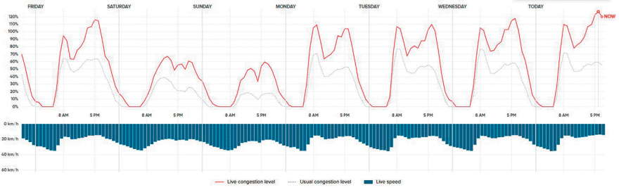 Ωριαία ταχύτητα και κυκλοφοριακή συμφόρηση: Οπως φαίνεται στο γράφημα της Tomtom για τις διακυμάνσεις της κίνησης στην Aθήνα την τελευταία εβδομάδα, η κορύφωση έγινε στις 6 το απόγευμα της περασμένης Πέμπτης, όταν η μέση ταχύτητα έπεσε στα 14 χιλιόμετρα την ώρα