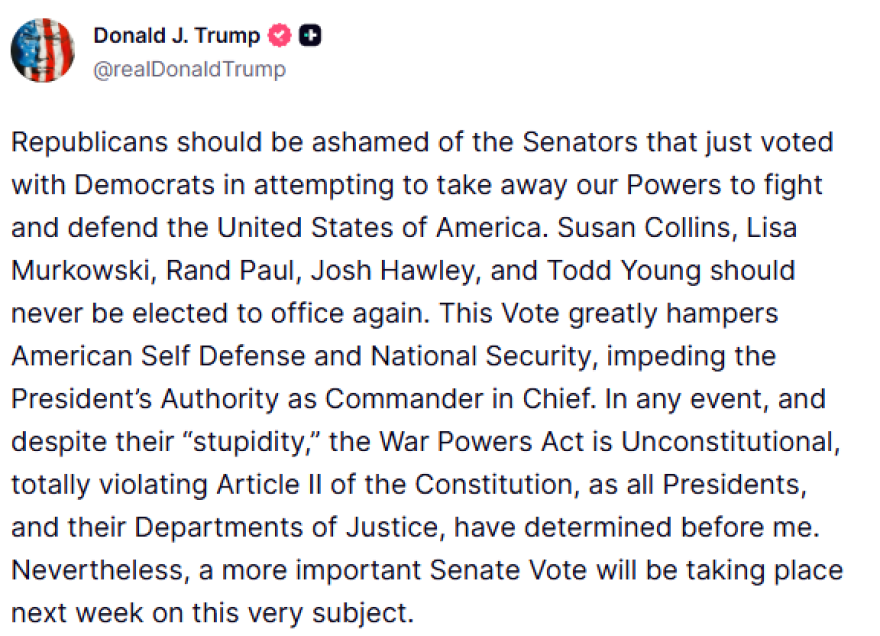 Ο Λευκός Οίκος δεν αποκλείει νέες στρατιωτικές επιχειρήσεις στη Βενεζουέλα, ενώ ο γερουσιαστής Τιμ Κέιν διερωτήθηκε για την ανάγκη πίεσης στο κόμμα του προέδρου. Δυο ρεπουμπλικάνοι γερουσιαστές έκαναν μεταβολή χθες Τετάρτη επιτρέποντας να πεθάνει πριν βγει από το αυγό σχέδιο απόφασης του αμερικανικού Κογκρέσου με σκοπό να περιοριστούν οι εξουσίες του Ντόναλντ Τραμπ ως προς τη διεξαγωγή στρατιωτικών επιχειρήσεων στη Βενεζουέλα, έπειτα από τις σφοδρές επικρίσεις του προέδρου εναντίον ανταρτών της παράταξής του.