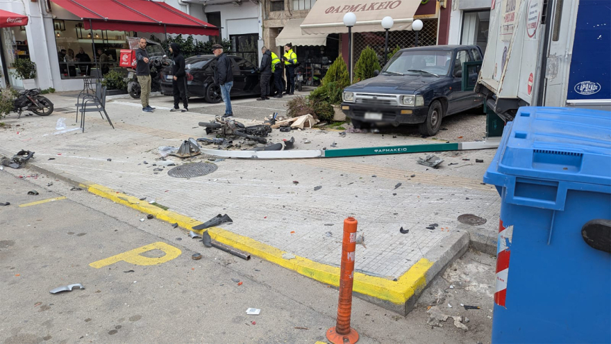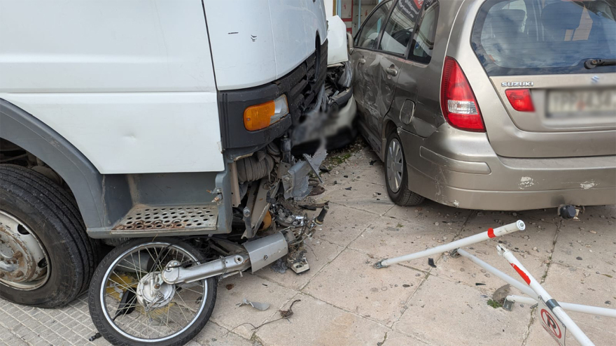 Από τη σύγκρουση τραυματίστηκαν ελαφρά ο οδηγός και ο συνοδηγός του ενώ το φορτηγό συνέχισε την ανεξέλεγκτη πορεία του, έσπασε τα κολωνάκια από το πεζοδρόμιο, παρέσυρε τέσσερα σταθμευμένα μηχανάκια και "καρφώθηκε" σε δύο παρκαρισμένα ΙΧ.
