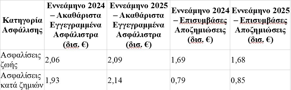 Παρά την αύξηση των ασφαλίστρων οι αποζημιώσεις καταγράφουν τάση μείωσης, παραμένουν ωστόσο υψηλές. Η παραγωγή ακαθάριστων εγγεγραμμένων ασφαλίστρων στις ασφαλίσεις ζωής την περίοδο Ιανουαρίου-Σεπτεμβρίου του 2025 ανήλθε σε 2,1 δισ. ευρώ, αυξημένη κατά 1% σε σύγκριση με την αντίστοιχη περίοδο του προηγούμενου έτους. Από το παραπάνω ποσό, 1 δισ. ευρώ συνδέεται με επενδύσεις, αυξημένο κατά 5%, και αποτελεί 47% των συνολικών ακαθάριστων εγγεγραμμένων ασφαλίστρων δραστηριοτήτων ζωής, έναντι 45% την αντίστοιχη περίοδο του 2024.